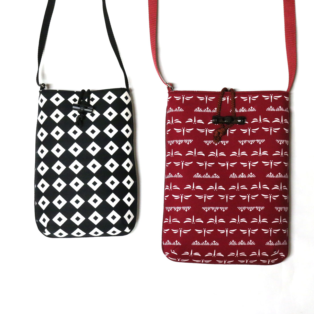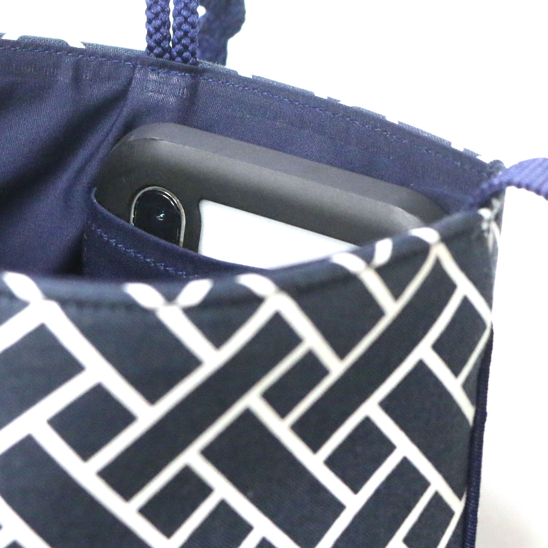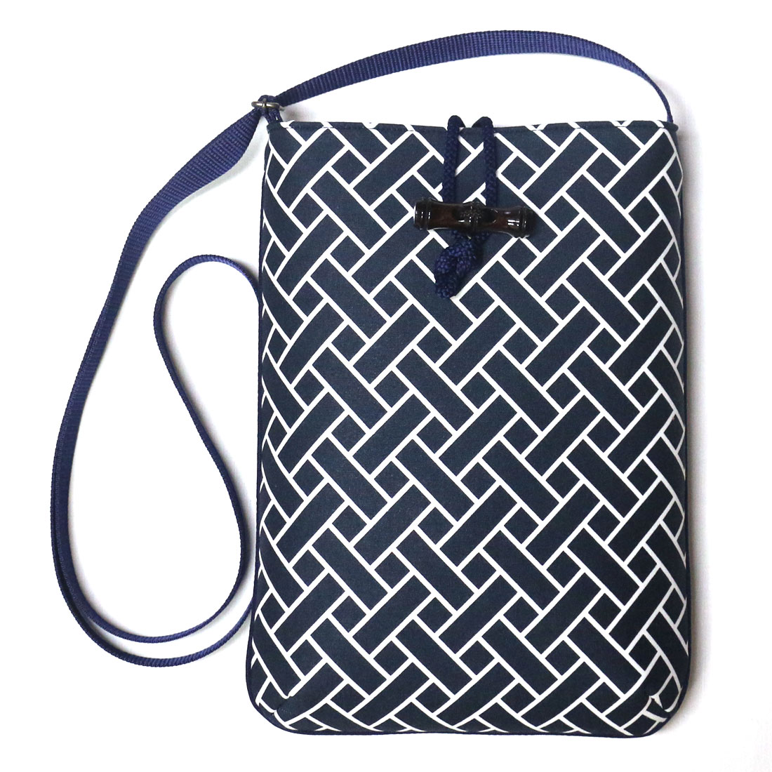 籠目柄のアレンジ模様の生地を用い、仕立てました。通常の袋物と違い、芯にスポンジ、側面にはパイピングを仕様して触り心地が良く、しっかりとした作りになっております。肩紐は、調節可能。道中袋(大)の口元は、ファスナー仕様になっております。内ポケット付きです。