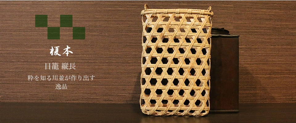 祭礼時のシャレモノと言えば、目籠。時代の流れに沿った、変形型の縦長です。スマートフォンを縦に入れるなど、お財布以外の小物を入れる様なサイズになってます。丹精に編み込まれた目籠は、木場の川並で角乗りだった榎本氏が製作しております。粋を知るからこそできる美しい製品は、そこいらの物とは段違いです。