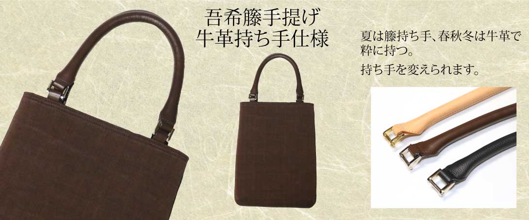 吾希籐手提げ用の持ち手取付け部分を真田紐から牛革に変更する有料オプションです。 色は黒、焦げ茶、ヌメの3色からご選択ください。