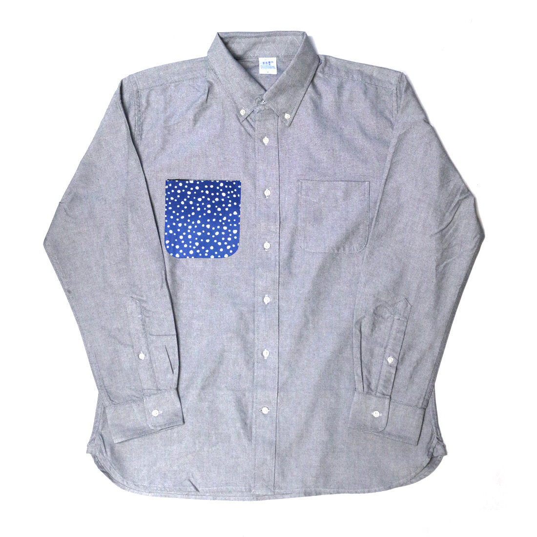 手ぬぐいや織物の生地を使用した和柄ポケットを施し、ダブルポケットにしたオックスフォードボタンダウンのロングスリーブシャツです。クラシカルなスタイルで、ハリのある生地感がインナーの透けを防ぎます。袋物を製作した際の残布を使ったSDGsな製品です。※柄によっては、再利用生地を使用していないものもございます。シャツは2色から、ポケットの仕様は、1柄とコンビネーションの2柄からご選択でき、柄は多種ご用意しておりますので、ご希望の柄をご選択頂けます。